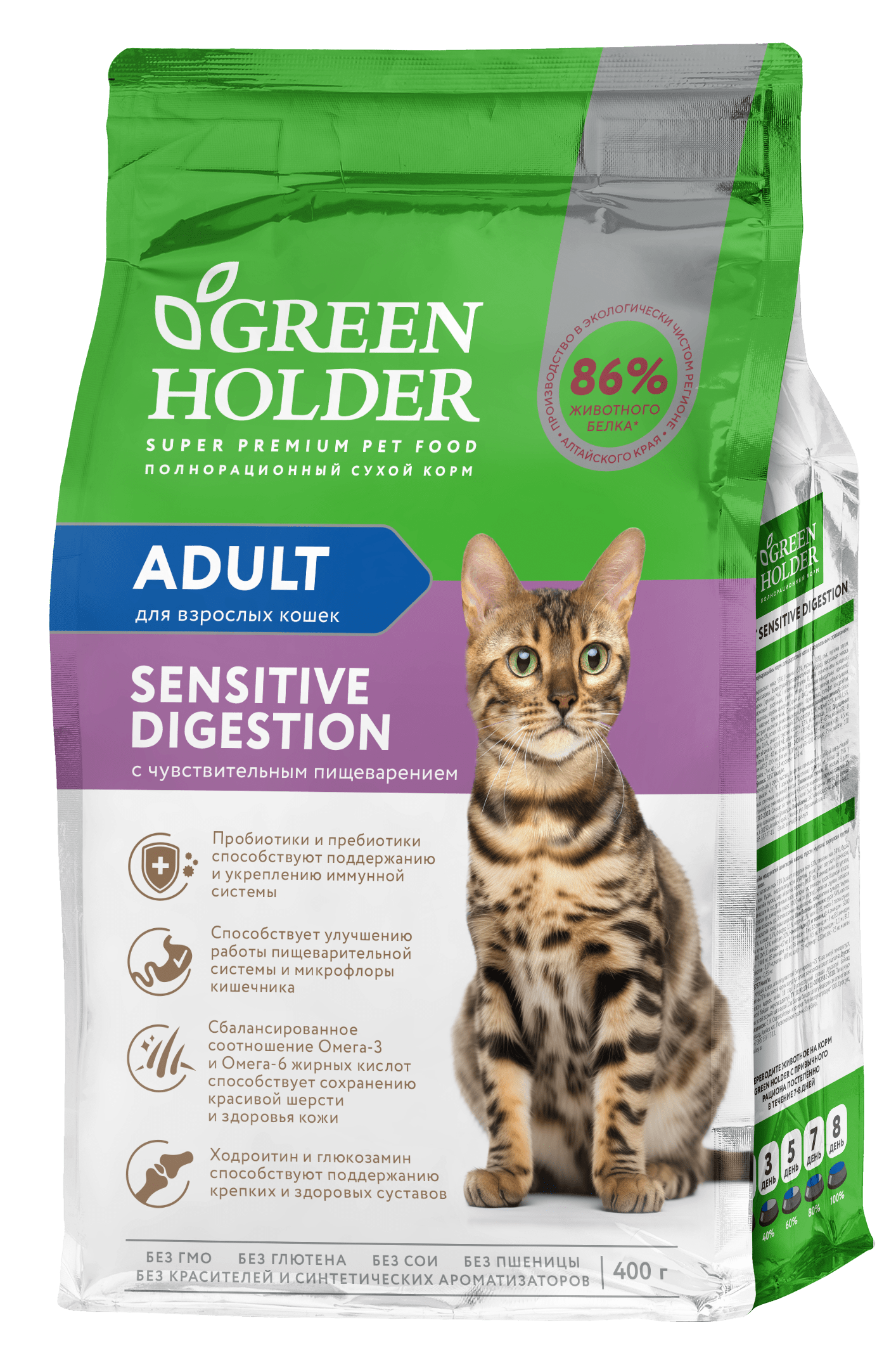 Рацион Green Holder ADULT SENSITIV DIGESTION разработан специально для кошек с чувствительным пищеварением. Основным белковым компонентом корма является мясо индейки - гипоаллергенный источник легкоусвояемого белка. Повышенное содержание пребиотиков МОС и ФОС стимулируют рост и активность полезных бактерий толстого кишечника, нормализуют микрофлору кишечника, препятствуют возникновению дисбактериоза и поддерживают здоровье пищеварительного тракта. Таурин, входящий в состав корм, необходим для поддержания здоровья сердца, функции почек и мочевого пузыря. Оптимальное соотношение омега-3 и омега-6 жирных кислот способствуют улучшению состояния шерсти и сохранению здоровья кожи животного. Для укрепления и поддержки суставов и связок в состав рецептуры входят хондропротекторы.
