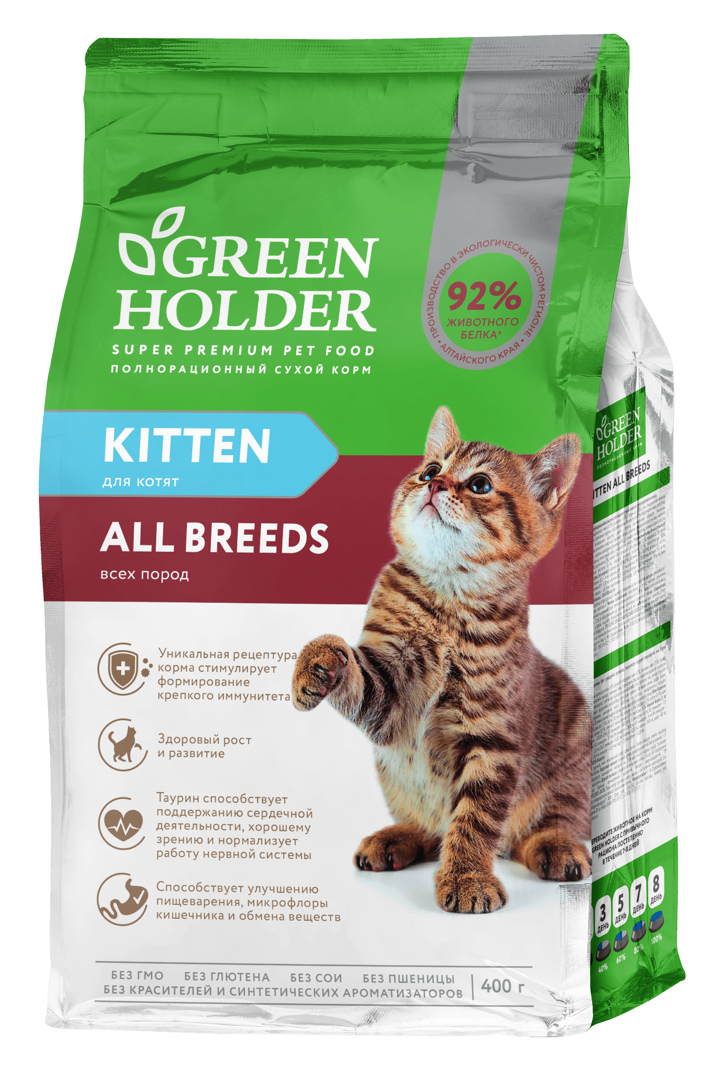 Рацион Green Holder KITTEN ALL BREEDS разработан специально для обеспечения растущего организма всеми необходимыми питательными веществами для правильного развития в период активного роста. Корм также подходит беременным и кормящим кошкам. Повышенное содержание питательных веществ, необходимых витаминов и минералов полностью восполняет их физиологические потребности. Входящие в состав жиры и оптимальное соотношение омега-3 и омега-6 жирных кислот способствуют улучшению состояния шерсти и сохранению здоровья кожи животного. Пробиотики и пребиотики нормализуют работу микрофлоры желудочно-кишечного тракта, улучшают моторную функцию кишечника, оптимизируют процесс пищеварения и укрепляют иммунитет. Оптимальный баланс кальция и фосфора обеспечивает прочность костей скелета у растущих котят, а хондропротекторы принимают участие в образовании хрящей и способствуют укреплению суставов и связок. Таурин способствует поддержанию сердечной деятельности, хорошему зрению и нормализует работу нервной системы.