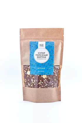 Почувствуйте себя ребёнком или побалуйте своих детей специальным комплексом для сладкоежек! Все ингредиенты в нём абсолютно натуральные - Вам не нужно переживать об этом. Только представьте: воздушная гречка, кукурузные хлопья, глазированный с какао рис. Ммм! Детский суперзавтрак определённо понравится всем, кого Вы решите им угостить! В полезном составе, также, сушеная пророщенная зелёная гречка, семечки подсолнечника, темный лён. И, конечно же, в нём нет глютена.