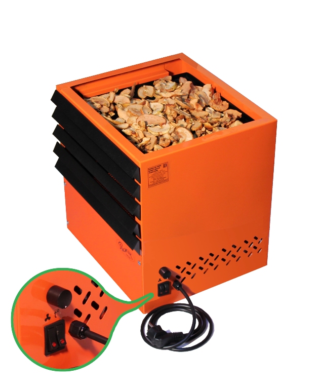 Сушилка для грибов овощей и фруктов "Рыжик супер" изготовлена из стали с последующей порошковой окраской. Имеет пять поддонов для сушки размерами 30х30 сантиметров, изготовленные из металлической сетки, окрашены порошковой краской. В основе конструкции сушилки для грибов вентилятор, дополненный керамическим нагревательным блоком мощностью 750 Ватт*. Поток нагретого воздуха, прошедшего через керамический нагревательный блок, направляется через рассекатель на поддоны, таким образом происходит сушка. Продукт высыхает, равномерно отдавая влагу; соблюдается щадящий режим сушки. Керамический нагревательный блок потребляет меньше электроэнергии при этом его теплопроизводительность выше. Помимо этого керамический блок достигает расчетной температуры практически сразу после включения сушилки. Таким образом, сушилка для грибов овощей и фруктов "Рыжик супер" на базе керамического нагревательного блока позволяет обрабатывать продукты быстрее и безопаснее, а главное - дешевле. Используя сушилку для грибов и фруктов "Рыжик супер", вы сможете заготовить на зиму большое количество грибов, фруктов и трав. *Нагревательными элементами в керамических блоках служат P.T.C. термисторы — полупроводниковые резисторы с положительным температурным коэффициентом, электрическое сопротивление которых, а следовательно и мощность зависит от температуры их поверхности. То есть, чем выше температура P.T.C. термистора, тем меньше потребляемая мощность. Данная обратная связь не допускает нагрева элементов свыше точки их переключения (250°С), обеспечивая этим полную пожарную безопасность, а также препятствует возникновению каких–либо окислительных процессов (сжигание кислорода, образование СО, выделение специфических запахов горения частиц пыли), которые нередко присутствуют на поверхности высокотемпературных ТЭНов (трубчатых электронагревателей).