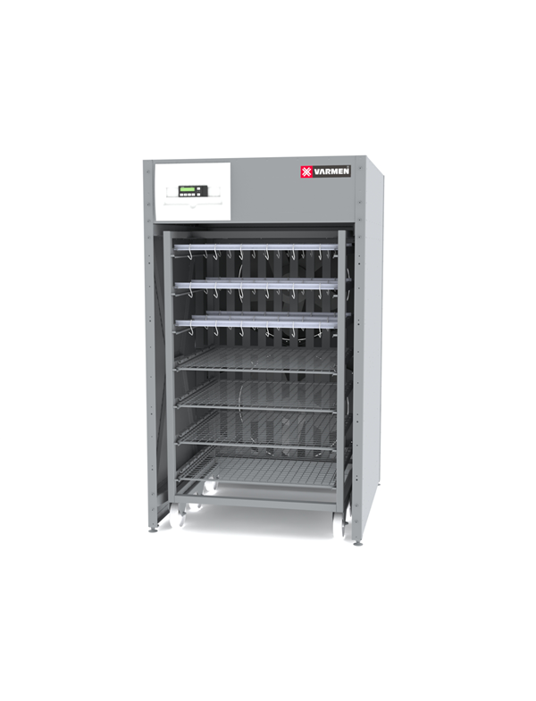 Сушильно-вялочная камера Ижица-СВ-Z предназначена для предварительной подсушки продукции перед загрузкой в Ижица-Z115 и Varmen-115. Конструкция сушильной камеры рассчитана на рамы этих коптилен.Эффективность использования заключается в интенсивном обдуве (поток 10000 м3/час) воздухом с температурой 14-25 °С. При этом продукт подсушивается, но не нагревается, что обеспечивает уменьшение потерь на шаге сушка и ускорение копчения.Используя Ижица-СВ-Z для сушки позволяет увеличить производительность коптильных камер Ижица-Z115 и Varmen-115 на 30-40%.