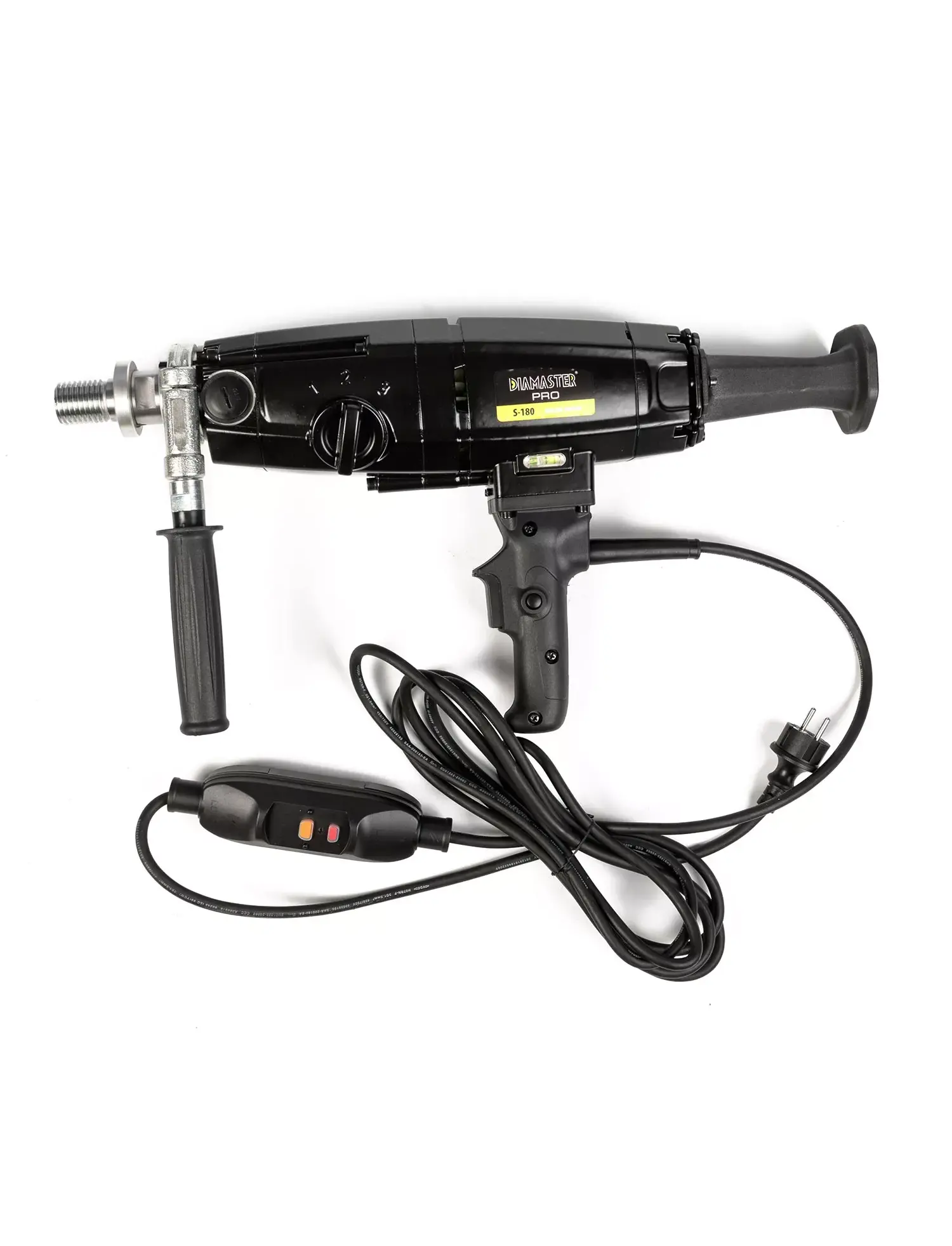 Может применяться вручную или в составе со стойки с посадочной проушиной 60 мм. Используется совместно с коронками диаметром не более 180 миллиметров. Установка предназначена для сухого и мокрого реза. Предусмотрена возможность подключения строительного пылесоса, что позволит существенно снизить пылеобразование. Предохранительная муфта редуктора обеспечивает безопасную эксплуатацию. Имеет три скорости сверления 520/1400/2900 оборотов в минуту.