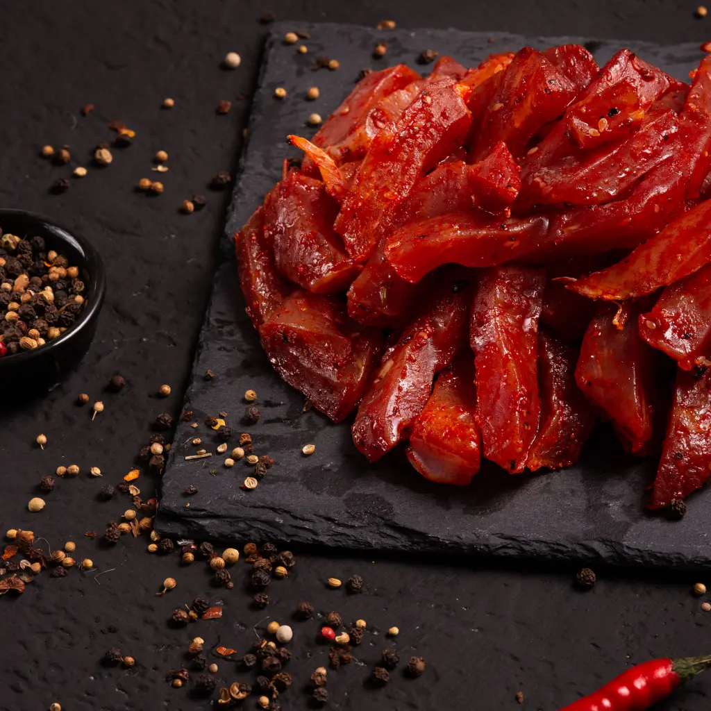 Аппетитные ломтики, вобравшие классический тайский букет: освежающий лайм и лемонграсс, жгучий чили, ароматный галангал, глубина рыбного соуса. Натуральное вяление подчеркивает идеальную гармонию кислого, острого, соленого и сладкого. Пикантный, свежий, с экзотическим ароматом – дерзкий перекус для смелых!