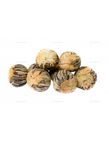 Связанный чай просто расцветает при заваривании букетом прекрасных хризантем. Напиток обладает прекрасным сочетанием вкуса зеленого чая и цветочного аромата. Богат витаминами и минералами, укрепляет нервную систему, стимулирует обмен веществ.