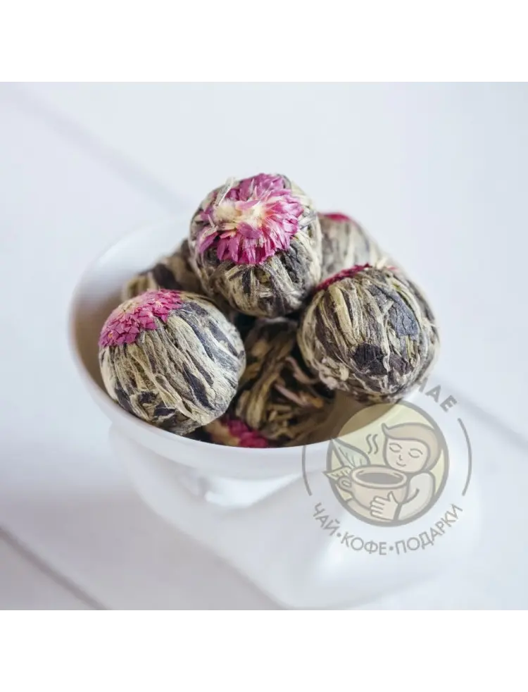 Необыкновенно вкусный и ароматный связанный зеленый чай родом из китайской провинции Юннань. Чайные листья сворачивают вручную в небольшой шарик, помещая в его центр ярко-розовый цветок клевера. Заваренный настой имеет очень нежный, мягкий вкус и содержит массу полезных компонентов: микроэлементы, витамины, танины, катехины и др.