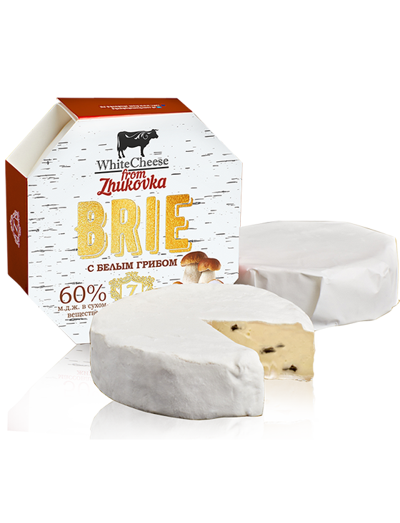 Мягкий сыр White Cheese from Zhukovka Бри с белыми грибами – это изысканный продукт для настоящих гурманов. Cыр из коровьего молока с добавлением белых грибов, которые придают ему неповторимый аромат и вкус.