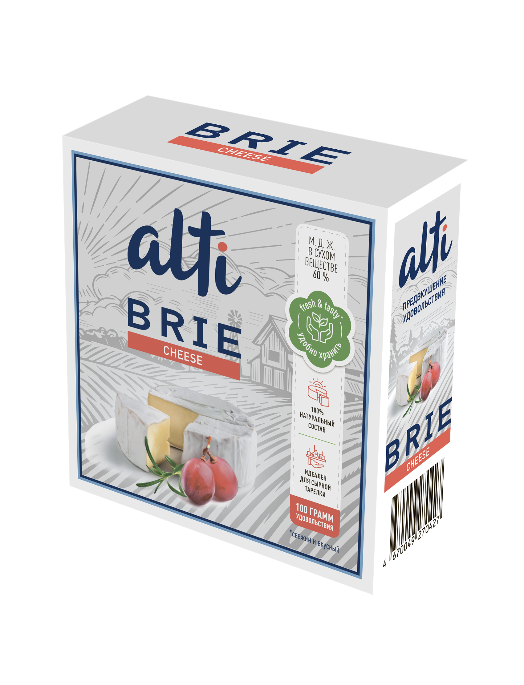 Brie Alti - мягкий сыр с благородной белой плесенью, созданный по уникальному французскому рецепту. Нежный пряный вкус не оставит равнодушным самого изысканного гурмана. Технология производства позволяет сохранять неизменными привычные вкусовые качества сыра в течение 12 месяцев, раскрывая в полной мере грибные и ореховые нотки в аромате Brie Alti.
