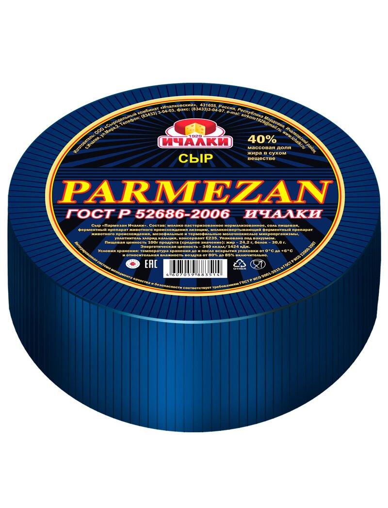 Сыр "Пармезан Ичалки" – изготовлен по типу итальянского одноименного сыра, отличительной чертой которого является длительный срок созревания - это придает ему неповторимый пикантный вкус и аромат. В зависимости от срока созревания может иметь как плотную, так и ломкую, крошливую структуру, поэтому при длительных сроках выдержки его не режут, а откалывают специальным ножом. Благодаря высокой плотности его можно натереть в виде воздушной стружки. Под воздействием высокой температуры сыр «Пармезан» равномерно плавится и красиво застывает, придавая неповторимый вкус блюду. Благодаря этим качествам его можно использовать в приготовлении множества салатов и горячих блюд. Прекрасно сочетается с фруктами, медом и вином.
