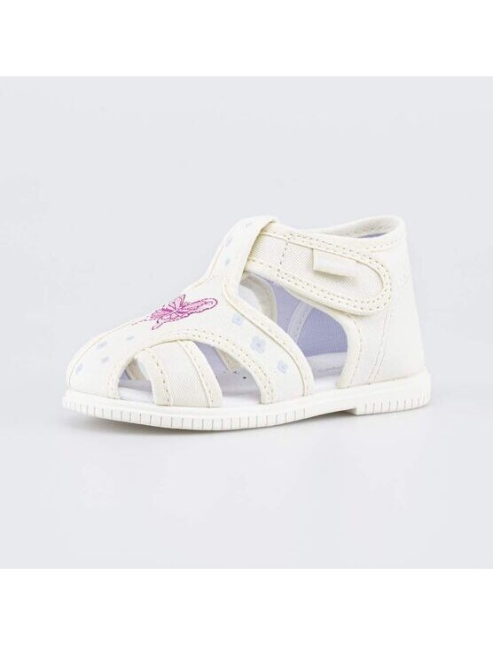 Текстильная обувь для первых шагов Бабочка - это детские сандалии для девочки, которые украшены милой вышивкой и подходят для детей, которые только начинают ходить. Верх и подкладка текстильных сандалий изготовлены из хлопка, стелька - из натуральной кожи. Эти гипоаллергенные и дышащие материалы создают максимально комфортный микроклимат внутри детской обуви. Сандалии не содержат элементов, которые легко оторвать и проглотить. Сандалии на липучках легко отрегулировать по полноте и подъему, их легко обувать и снимать. Подошва из облегченной резины хорошо амортизирует и не оставляет следов на полу, поэтому сандалии можно использовать в качестве сменной обуви.