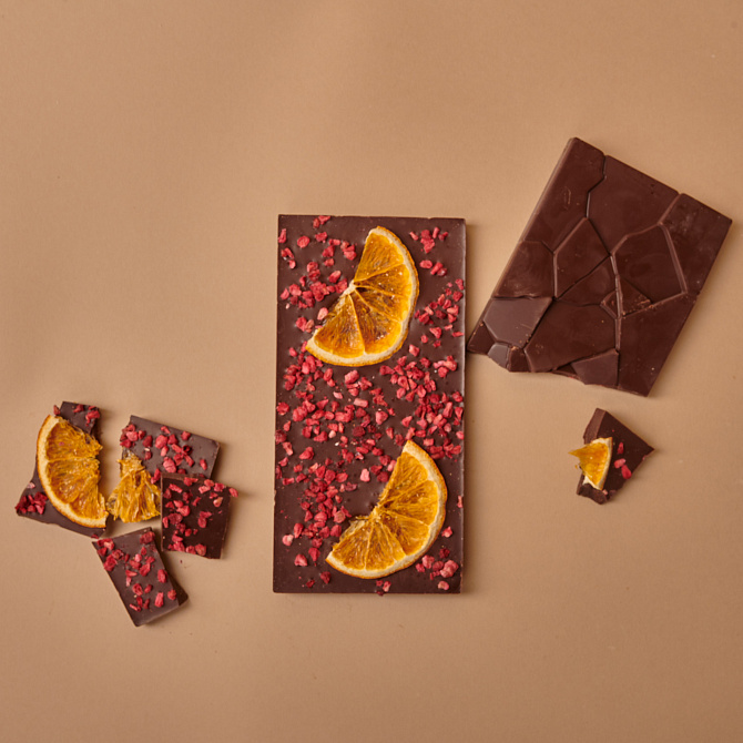 Яркое сочетание натуральных долек апельсина и сублимированной малины, создают изысканный альянс вкуса и пользы, а темный шоколад обволакивает вуалью непревзойденного наслаждения.