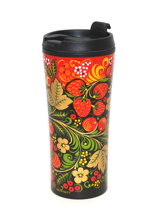 Термокружка 0,5 литра. Изготовлена в полном соответствии с традиционной хохломской технологией золочения. Роспись «Клубника». Возможно разместить заказ на изготовление изделия с другими видами росписи. Срок изготовления персонального заказа 21-45 дней. Лаковое покрытие и многократный высокотемпературный обжиг делает изделие влагозащищенным и износоустойчивым. Все применяемые при производстве материалы натуральны и экологичны. Термокружка предназначена для хранения холодных и горячих напитков, он будет хорошим подспорьем рыбакам, охотникам и любителям активного отдыха. На каждом изделии имеется подпись автора росписи. Упаковка из брендированного картона.