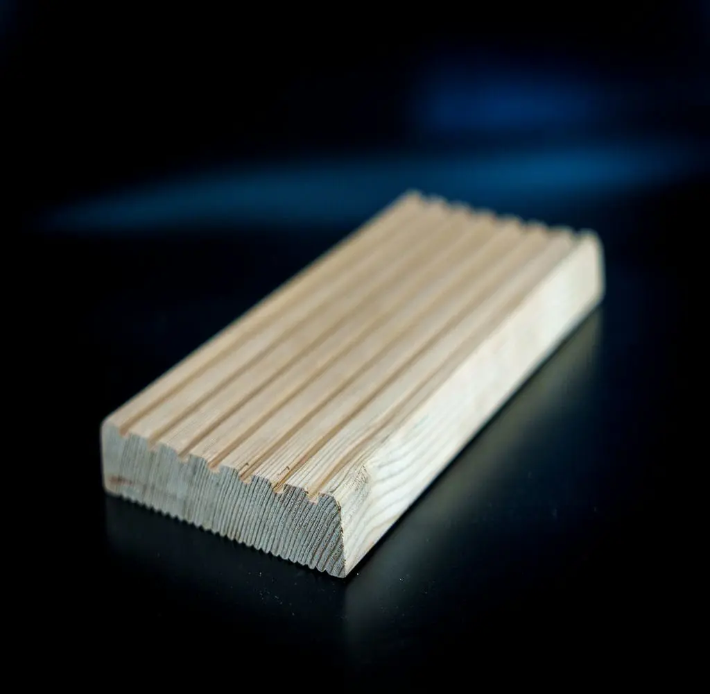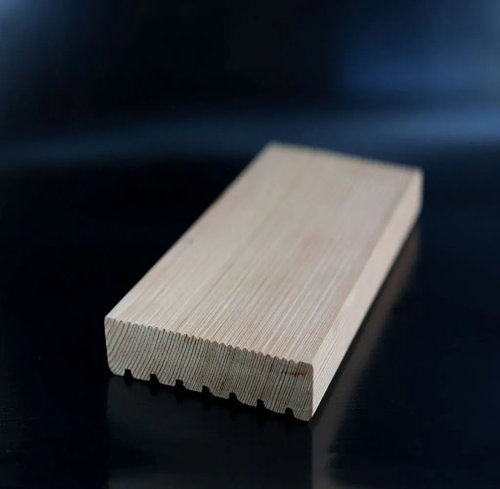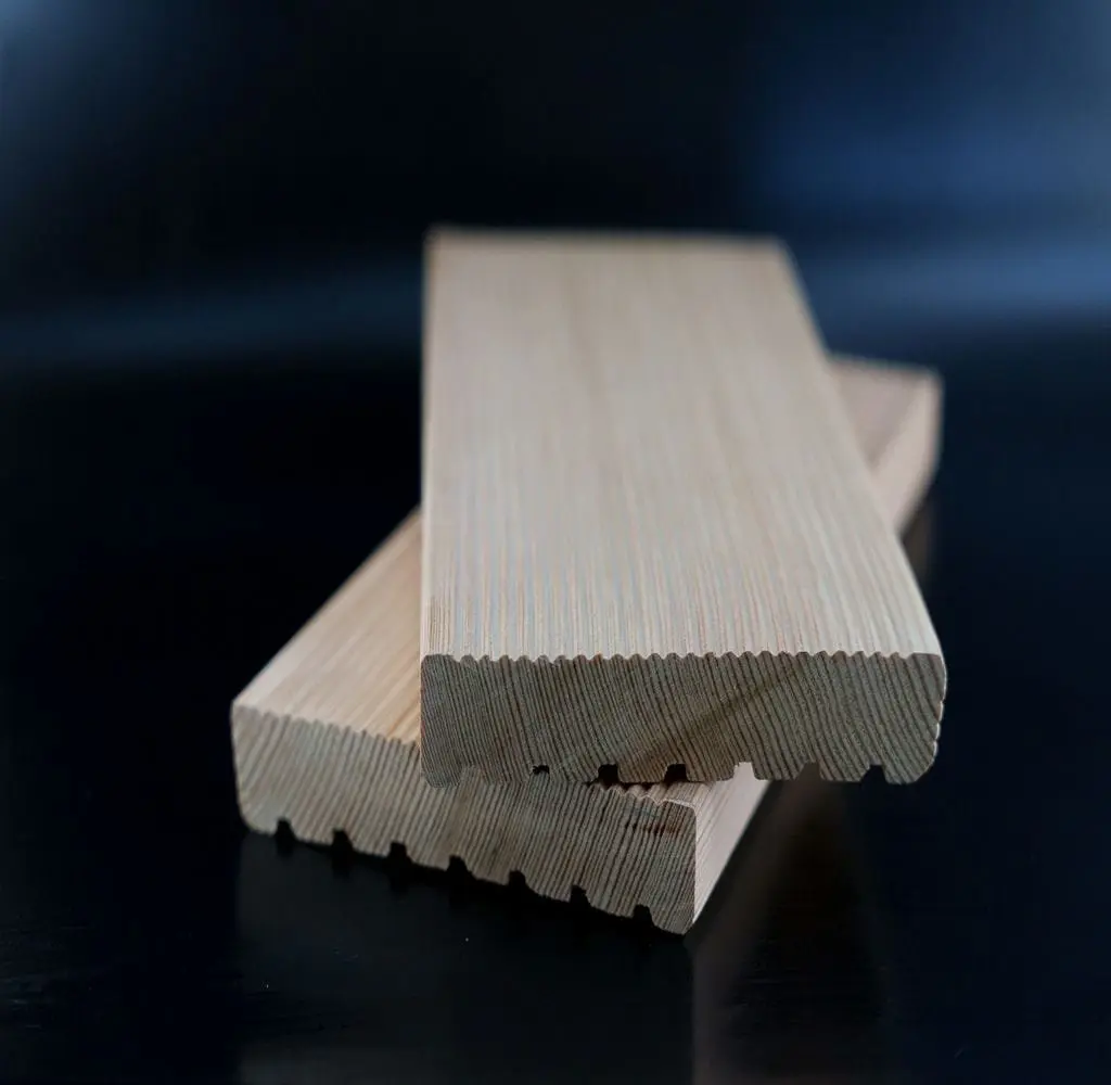 Террасная доска «вельвет» - это отделочный материал из лиственницы без соединительных элементов, с крупными продольными бороздами по всей длине и системой антислип. Такое название террасная доска получила за счёт сходства с тканью вельвет и «бархатной» текстуры на ощупь. С обратной стороны доски по всей длине расположены компенсационные канавки для снятия напряжения при перепадах температуры и влажности. Рифлёная фактура профиля защищает от скольжения, даже при контакте с водой.