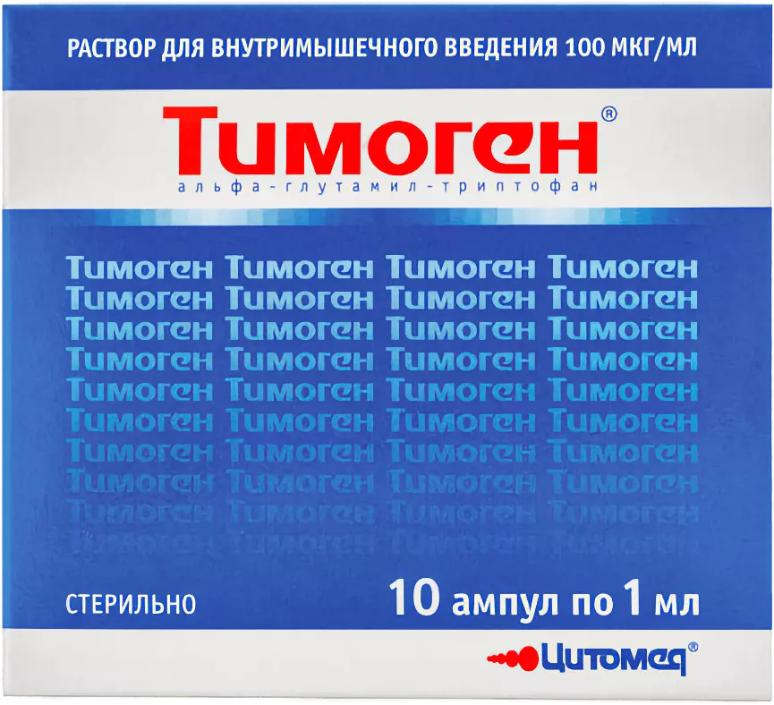 Тимоген раствор для внутримышечного введения - это иммуномодулирующий лекарственный препарат на основе синтетического дипептида (альфа-глутамил-триптофан), используемый для стимуляции иммунитета, лечения вирусных/бактериальных инфекций и ускорения регенерации тканей. Выпускается в виде прозрачного раствора 0,01% в ампулах по 1 мл, обычно по 5 или 10 штук в упаковке.