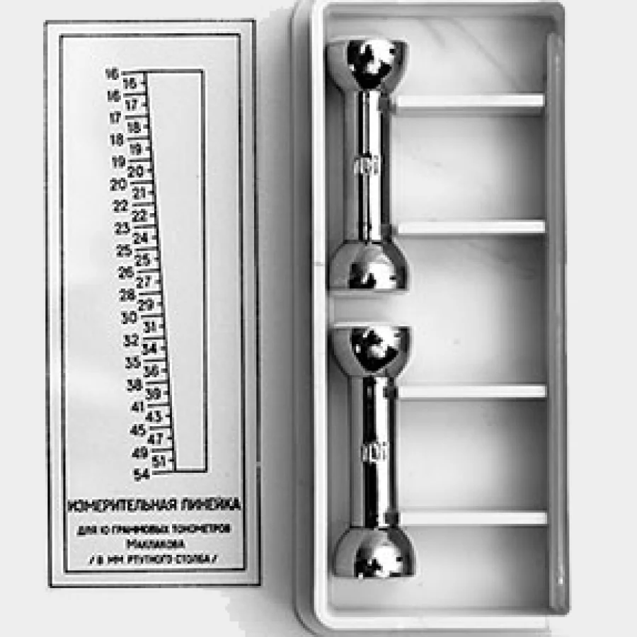 Тонометр внутриглазного давления (по Маклакову) - это контактный офтальмологический инструмент (набор из двух грузиков по 10 г) для прямого измерения внутриглазного давления (ВГД). Он необходим для диагностики глаукомы и оценки состояния зрительного нерва путем анализа отпечатка краски с грузика, сплющивающего роговицу, что позволяет определить уровень давления с высокой точностью. Габаритные размеры (в футляре) - 87*42*16 мм. Масса (в футляре) - не более 0,075 кг.