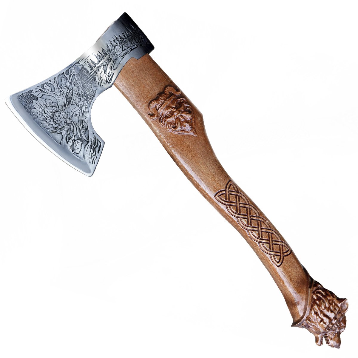 Топор "Викинг-Сувенир" предназначен для подарков и сувениров. Может использоваться и для работ по дереву, так как имеет все механические характеристики, как и обычный топор. Лезвие топора изготовлено из прочной пружинной стали марки 60Г. Технологический процесс формообразования рабочей части топора включает в себя ковку и особую термическую обработку, благодаря чему лезвие приобретает твердость и стойкость. Топорище выполнено индивидуально к каждому топору с художественной резьбой по дереву, производится из древесины твердых лиственных пород и покрывается лаком. Топор покрывается хромом с последующим нанесением гравировки. Марка стали - 60Г. Твердость стали: 48-57 HRC. Ширина лезвия - 120 мм. Длина топорища 440 мм. Вес - 1,0 кг.