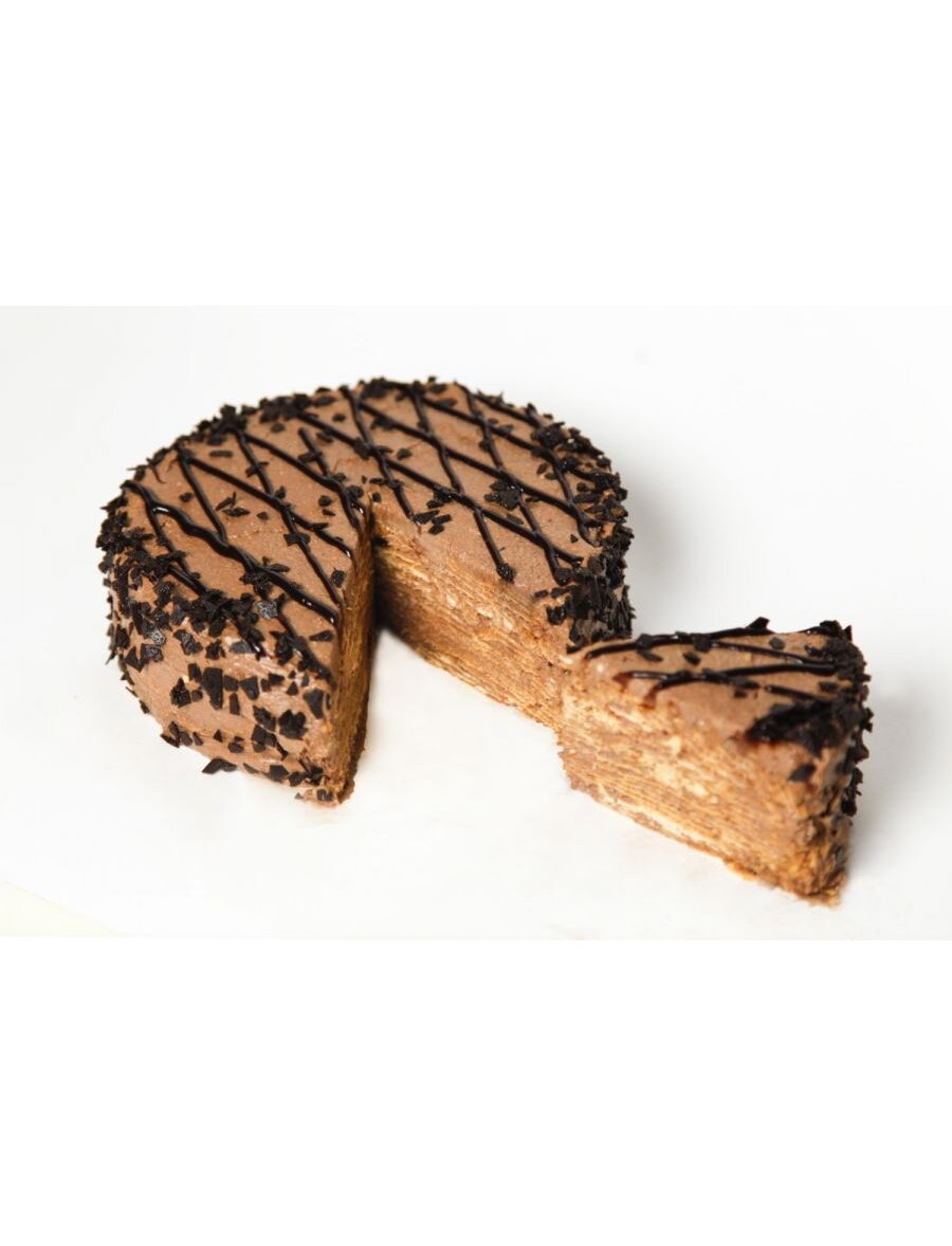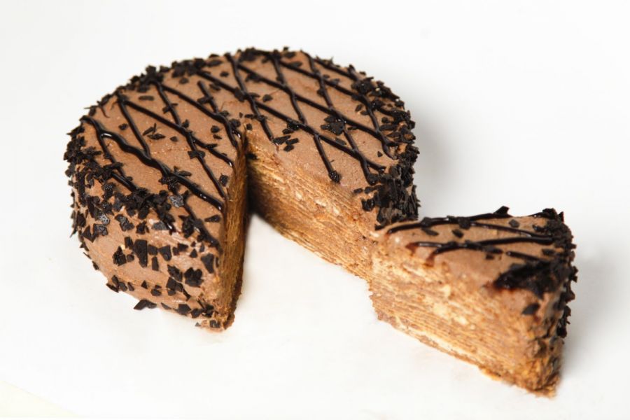 Слоенный торт представляет собой несколько пластов, прослоенный сгущёнкой с шоколадной глазурью, декорирован шоколадной крошкой.