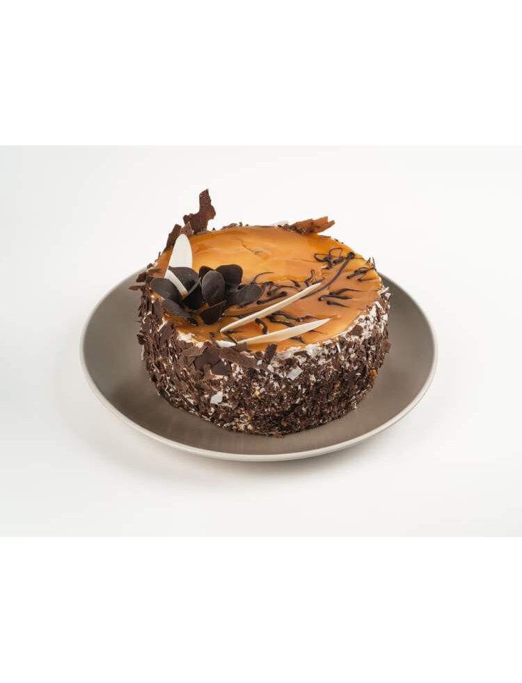 Медовые коржи прослоены начинкой шоколадной со взбитыми сливками и начинкой из черники. Поверхность украшена кондитерской глазурью.