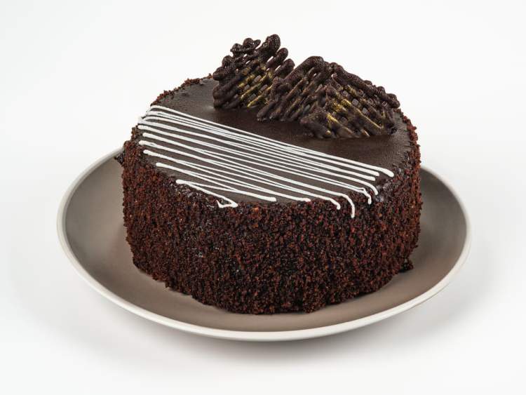 Слои шоколадного бисквита (брауни) прослоены шоколадной и вишневой начинкой со взбитыми сливками. Поверхность торта залита ганашом и украшена изделиями из кондитерской глазури.