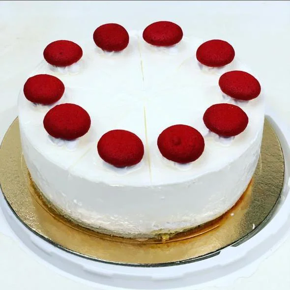 Белый бисквит с молочным муссом с начинкой из вишневого желе.