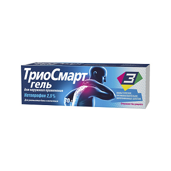 ТриоСмарт - это лекарственный препарат в форме геля для наружного применения, содержащий кетопрофен (2,5%). Он относится к нестероидным противовоспалительным средствам (НПВП) и используется для симптоматического лечения болей и воспалений: реактивный артрит (синдром Рейтера); остеоартроз различной локализации; периартрит, тендинит, бурсит, миалгия, невралгия, радикулит; травмы опорно-двигательного аппарата (в т.ч. спортивные), ушиб мышц и связок, растяжения связок, разрывы связок и сухожилий мышц. Форма выпуска - гель для наружного применения 2,5%.