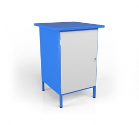 Тумба слесарная имеет цельносварную конструкцию, выполненную из профильной трубы квадратного сечения обшита листом металла толщиной 0,8 мм. Столешница состоит из влагостойкой фанеры толщиной 24 мм/ МДФ 25 мм и листа металла 1 мм (возможность изменение толщины металла до 20 мм). Тумба имеет распашную дверь закрывающуюся на замок. За дверью расположены две влагостойкие фанерные полки толщиной 10 мм. Сварная конструкция изделия свободно выдерживает ударно-маятниковые нагрузки, при работе напильниками, молотками, зубилами и ножовками по металлу. Покраска металлической тумбы полимерно-порошковая