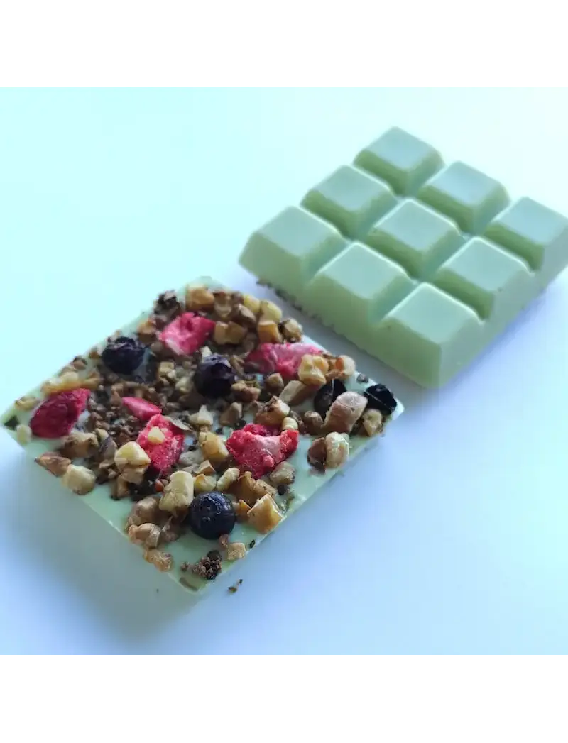 Состав: сахар, масло какао, сухое цельное молоко, соевыЙ лецитин, натуральный ароматизатор лимон, краситель Е132, Е100, ваниль, клубника сублимированная, грецкиЙ орех, черная смородина сублимированная