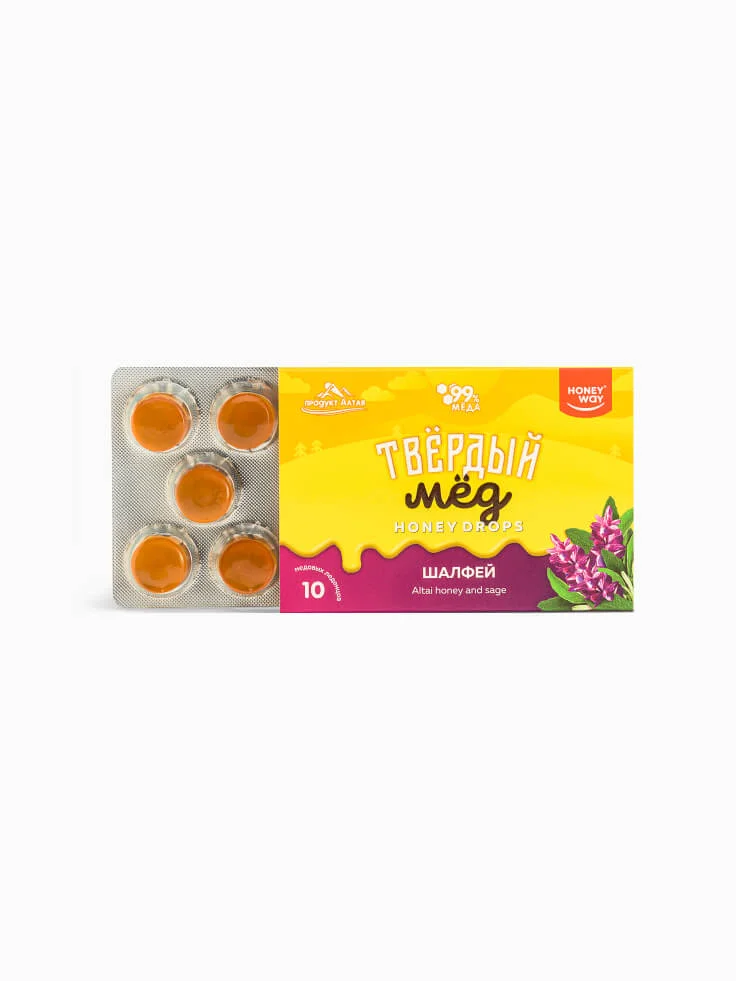 Медовая карамель со вкусом шалфея для детей и взрослых это 100% натуральный продукт без сахара и консервантов. Диетические конфеты на 99% состоят из натурального Алтайского мёда высшего качества. Шалфей оказывает успокаивающее и смегчающее действие на горло и связки, общеукрепляющее действие на весь организм. Мёд является природным антисептиком, поможет справиться с воспалением в горле, укрепит иммунитет. Леденцы помогут справиться с кашлем, хрипоптой, устраняют воспаления, раздражение, отек, убирают боль в горле. Пастилки для горла рекомендуются при первых симптомах простуды, от сухости и от боли в горле. Леденцы рекомендованы детям с двух лет.