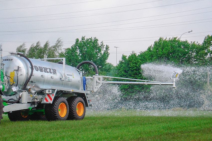 Штанга Twinjet разбрызгивает навозную жижу более традиционным способом посредством системы из двух форсунок. Две главные трубы заканчиваются маятниковыми насадками с большой шириной разбрызгивания.