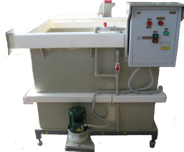 УДЭ-2К Установка приготовления и дозирования кислого электролита предназначена для приготовления и разлива кислых электролитов, кроме фторосодержащих электролитов, электролита хромирования и др. сильных окислителей. Установка УДЭ-2К содержит полипропиленовый бак для приготовления и хранения электролита с бортотсосами, размешенный на каркасе. В баке размещены датчик уровня и патрубок перемешивания электролита, теплообменник. Всасывающий патрубок насоса сообщается с баком через клапан, а нагнетательный патрубок сообщается через клапан с патрубком и через клапан с устройством заливки аккумуляторов. Выносной центробежный насос. Устройство заливки аккумуляторов содержит патрубок, являющийся одновременно электродом сравнения, и сигнальный электрод, размещенные в корпусе. На корпусе установлена опора, с возможностью перемещения. Каркас снабжен регулируемыми ножками. Объем бака для приготовления и хранения электролита - 0,6 м3. Производительность насоса - 1,0 м3/ч. Потребляемая мощность насоса -0,5 кВт. Напряжение сети трехфазного переменного тока - 323-418 В., 50 Гц. Масса - 140кг. Габаритные размеры - 1250х1050х1550мм.