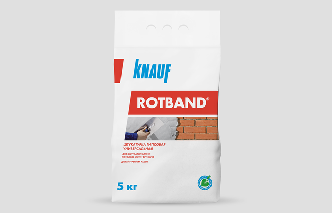 Универсальная гипсовая штукатурная смесь КНАУФ-Ротбанд 5 кг для высококачественного выравнивания стен слоем от 5 до 50 мм и потолков от 5 до 15 мм в помещениях с нормальной влажностью, а также в кухнях и ванных комнатах перед окраской, оклейкой обоями, укладкой керамической плитки и нанесением других финишных отделочных материалов. Для ручного нанесения.Сухая гипсовая смесь КНАУФ-Ротбанд предназначена для высококачественного оштукатуривания вручную стен и потолков внутри помещений с нормальной влажностью, а также в кухнях и ванных комнатах (с покрытием, обеспечивающим защиту от увлажнения). Наносится на обычные твердые основания (кладку из кирпича — керамического, силикатного, пустотелого и т. д., бетон, гипсовые и бетонные блоки, старые цементные и гипсовые штукатурки, газобетон и пенобетон), а также на сложные основания (ЦСП, ПГП, ГКЛ (ГСП), щепоцементные плиты и блоки). При соблюдении технологии работ позволяет достичь категории качества поверхности Q3 (К3).