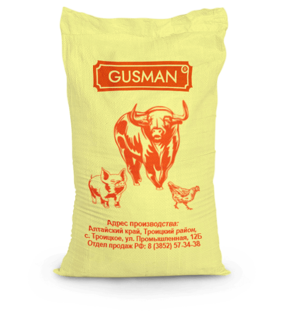 Смесь кормовая «GUSMAN». Подходит для кормления большинства видов с/х животных и птицы — свиней, крупного рогатого скота, кур и уток. В состав входят зерновые культуры нового урожая, питательные кормовые зернопродукты, пшеничные отруби, известняковая мука и соль, ароматизатор и подсластитель (улучающий поедаемость корма и пищеварение животного и/или птицы). Универсальное решение для вашего предприятия и/или хозяйства.