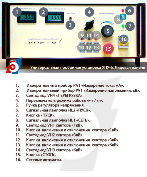 УПУ-6 Установка пробойная универсальная предназначена для испытания изоляции электротехнического оборудования и материалов переменным синусоидальным напряжением частотой 50 Гц и выпрямленным напряжением отрицательной полярности. Область применения – электротехника и энергетика. Установка пробойная универсальная УПУ-6 рассчитана для эксплуатации в помещениях или под навесом при рабочих значениях температуры воздуха от +5°С до +40° С, относительной влажности до 80% при температуре +20°С и атмосферном давлении 84,0 – 106,7 кПа (630 – 800 мм. рт. ст.). Приведенная относительная погрешность установки и измерения выходного напряжения - 3%. Максимальный выходной ток - 100 мА. Потребляемая мощность - 650 В.А. Габаритные размеры - 480х200х350мм. Масса - 25 кг. Время работы в непрерывном режиме при максимальной мощности - 8 часов.