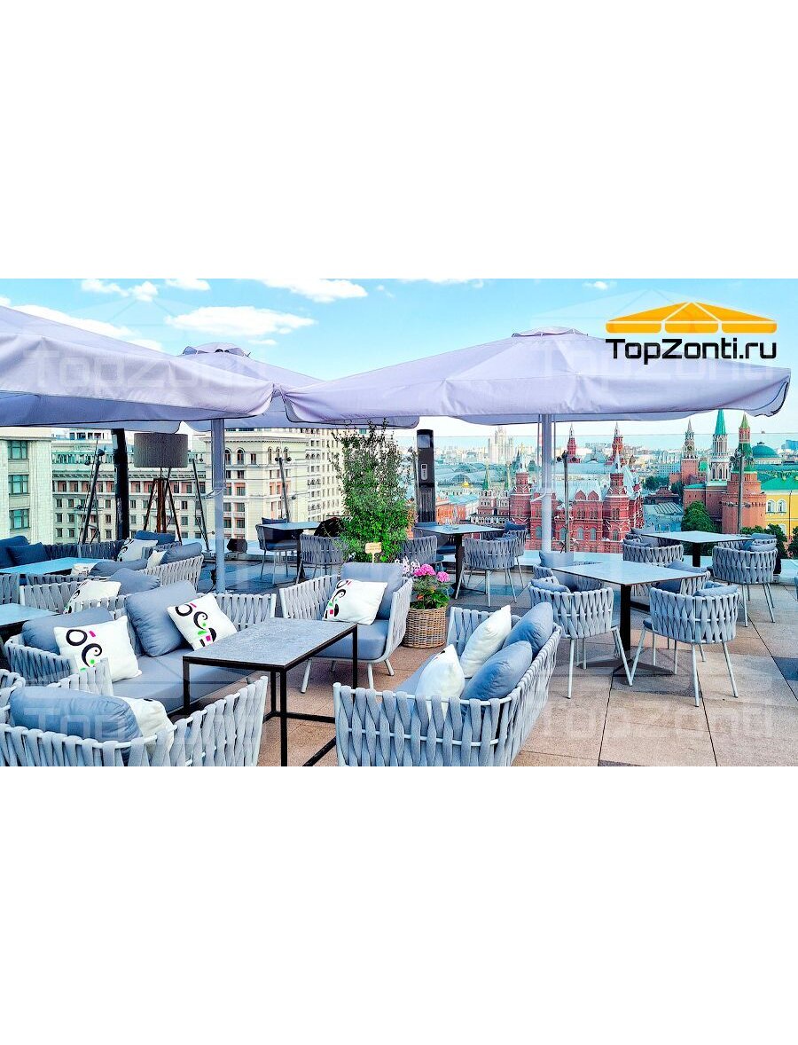 Тип: зонт с центральной опорой больших размеров Размеры типовые: Телескопы размером 4х4, 4.5х4.5, 5х5, 5.5х5.5, 6х6 м Высота до купола: Высота в сложенном виде -3.8-5.4 м в зависимости от размера купола. Применение: летнее кафе, терраса, веранда, дача, ресторан, загородный дом, зона отдыха, пляж Опора: Сталь с полимерным покрытием. Размер опоры 1400х1200 мм. Нижнее основание неразборное , в виде замкнутой опорной клети. Фиксация стойки зонта на 4 болта. Стойка: Труба стальная диаметром 102 мм, поворотно-откидная. Спицы: Алюминиевые . Кол-во спиц — 12 шт. Кол-во раскосов- 24 шт. Сечение спиц 30х20 мм ( сэндвич- с двойной стенкой). Толщина сечеия — 5 мм. Особенности: Высокая ветровая устойчивость по 3 классу до 12 м/с. Комплектующие: Россия Ткань: Оxford 600 DEN , с водоотталкивающей полиуретановой пропиткой. Плотность ткани 230 г./м.кв. Услуги по брендированию. Возможно Монтаж: Напольный. Класс ветростойкости: 2-3 ( до 12 м/с). Зависит от размера купола зонта. Складной механизм: Телескопический или рычажный на выбор. Срок службы зонта: 10 лет Срок службы ткани:3 года Форма зонта: Квдарат . Круг. Управление: ручное ( вертикальная тяга). Механизм сложения -телескоп. Пригруз:Плиты тротуарные- 500х500 мм. Вес на одну опору-250-300 кг в зависимости от размера купола. Плиты в стоимость не входят.