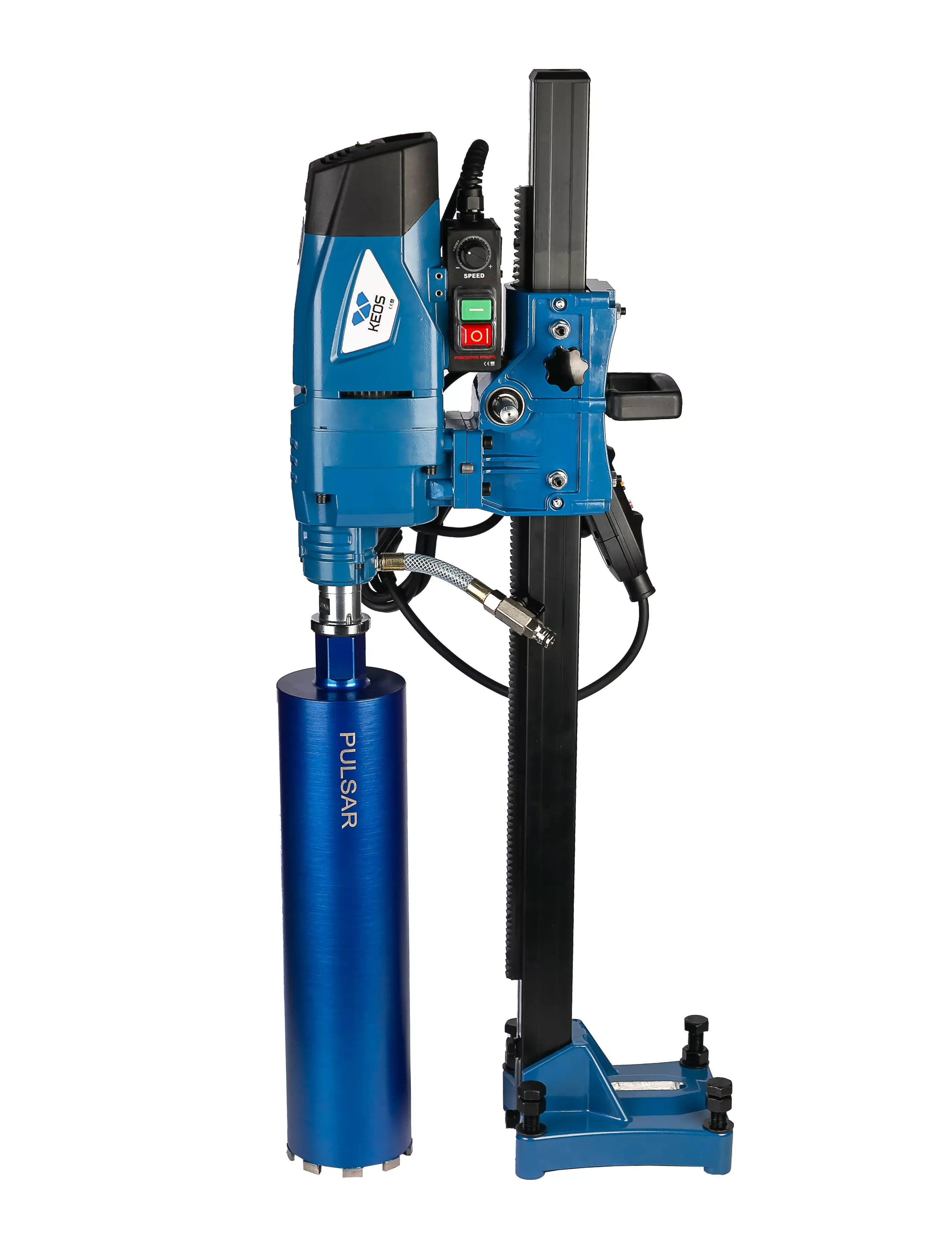 Установка для алмазного бурения KEOS KS-250 подходит для сверления бетона (в том числе армированного), кирпича, асфальта и других твердых материалов алмазными коронками диаметром до 250 мм.