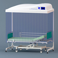 Установка реанимационная "Пеликан" применяется для лечения пациентов в условиях абактериальной воздушной среды, обеспеченной созданием ламинарного потока подогретого стерильного воздуха. Воздух из помещения прогоняется через систему фильтров и УФО установки, после чего становиться стерильным. Специальная рассеивающая решетка создает однонаправленный ламинарный поток воздуха, направленный сверху вниз в лечебную зону. Габариты - 1830*820*1840 мм.