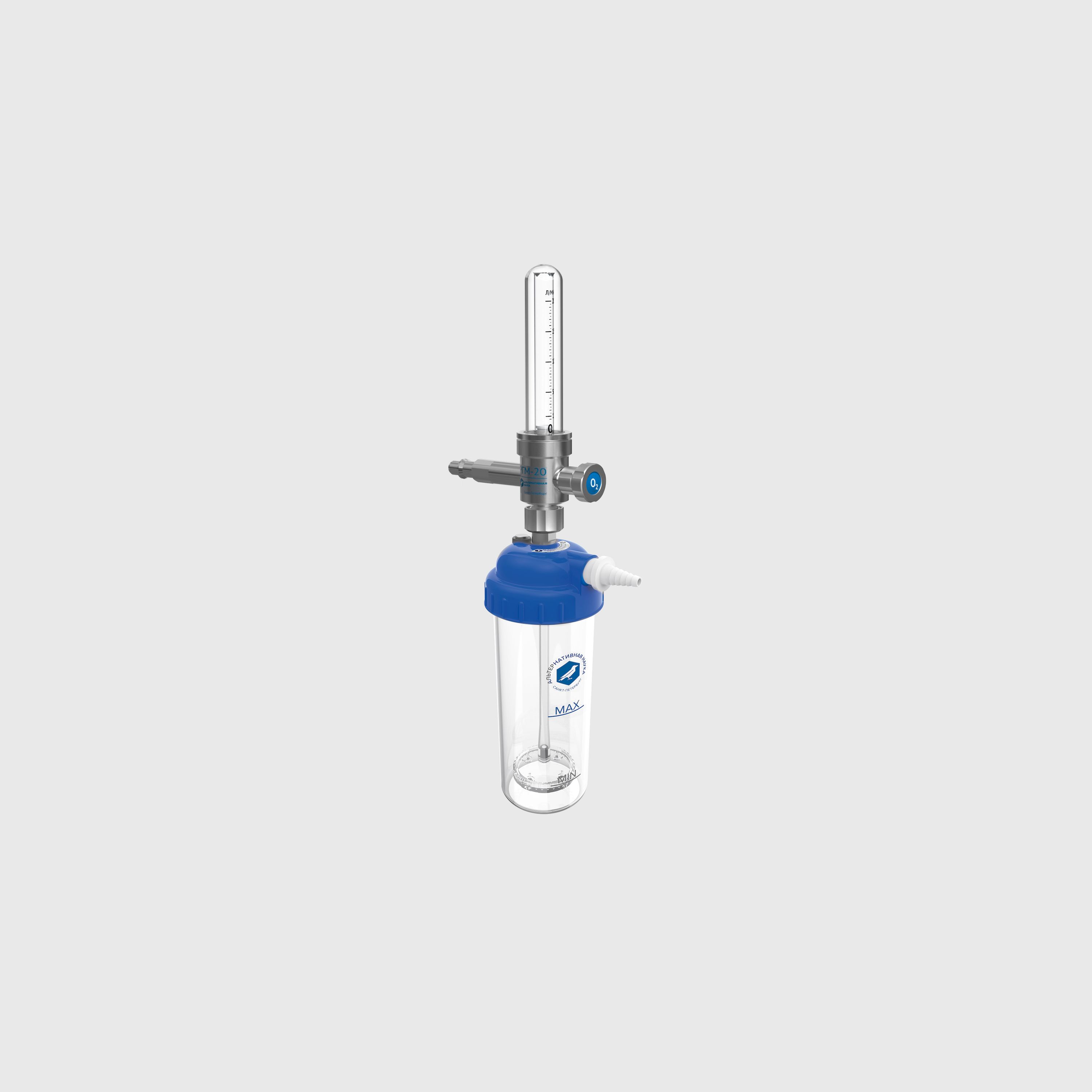 Увлажнитель кислорода медицинский УК-250 предназначен для открытых дыхательных систем (кислородная палатка, носовые канюли, маска). Составными частями увлажнителя кислорода являются: емкость с крышкой и расходомер с флуометром. При прохождении кислорода через емкость с дистиллированной водой, относительная влажность кислорода на выходе составляет не менее 85%. Расходомер с флуометром позволяет измерить скорость потока газа и плавно регулировать подачу газа(кислорода) пациенту. Емкость увлажнителя кислорода сделана из поликарбоната. Выходной порт подходит для коннекторов от любых интубационных трубок. Рабочий объем- 250мл.