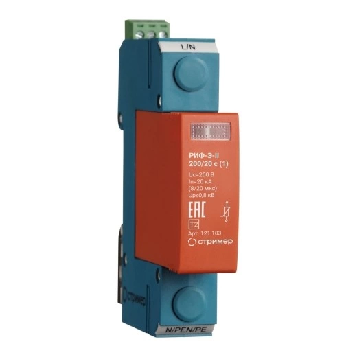 УЗИП класса II РИФ-Э-II 200/20 с (1) однополюсное устройство защиты от импульсных перенапряжений (УЗИП) класса II ограничивающего типа. Выполнено в виде сменного варисторного модуля и базы для подключения к сети. Предназначено для защиты фазного проводника L/N, L/PEN, L/PE. УЗИП снабжено терморасцепителем, визуальным индикатором и контактами дистанционной сигнализации повреждения рабочего элемента.