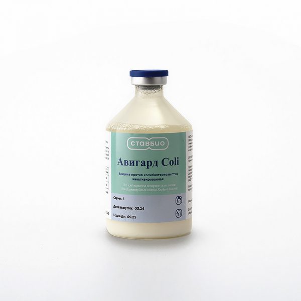 Вакцина против колибактериоза птиц инактивированная "Авигард Coli" применяется в качестве профилактики колибактериоза птиц (кур, индеек, уток и гусей). Вакцинации подлежат здоровые птицы, начиная с 1 - суточного возраста. Вакцину применяют парентерально двукратно с интервалом 14 суток. Вакцинацию птицы проводить за 30 суток до начала яйцекладки. Обеспечивает защиту потомства в течение первых 20 дней жизни у птиц за счет трансовариальной передачи материнских антител. Молодняк, выведенный из инкубационных яиц, полученных от птиц, вакцинированных против колибактериоза, первоначально иммунизируют в возрасте 20 дней. Формирование иммунного ответа на 21 сутки после двукратного применения. Ревакцинация взрослых птиц двукратно в дозе 0,5 мл через каждые 6 месяцев. Вакцина расфасована по 100 мл (500, 200 доз), 500 мл (2500, 1000 доз).