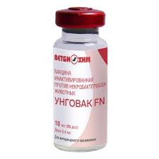 Вакцина УНГОВАК FN применяют для профилактической и лечебной иммунизации крупного рогатого скота в угрожаемых и неблагополучных по некробактериозу хозяйствах. Вакцина изготовлена из инактивированных формалином экзо- и эндотоксинов, с добавлением цельных бактериальных клеток производственных штаммов F. Necrophorum и полисахаридного адъюванта. По внешнему виду вакцина представляет собой суспензию от светло-серого до желтого цвета, при хранении которой образуется небольшой осадок, легко разбивающийся при взбалтывании. Вакцина расфасована по 10 мл (25 доз), 20 мл (50 доз) в стеклянные или полимерные флаконы соответствующей вместимости, укупоренные резиновыми пробками, укрепленными алюминиевыми колпачками. Одна коммерческая доза вакцины составляет 0,4 мл.
