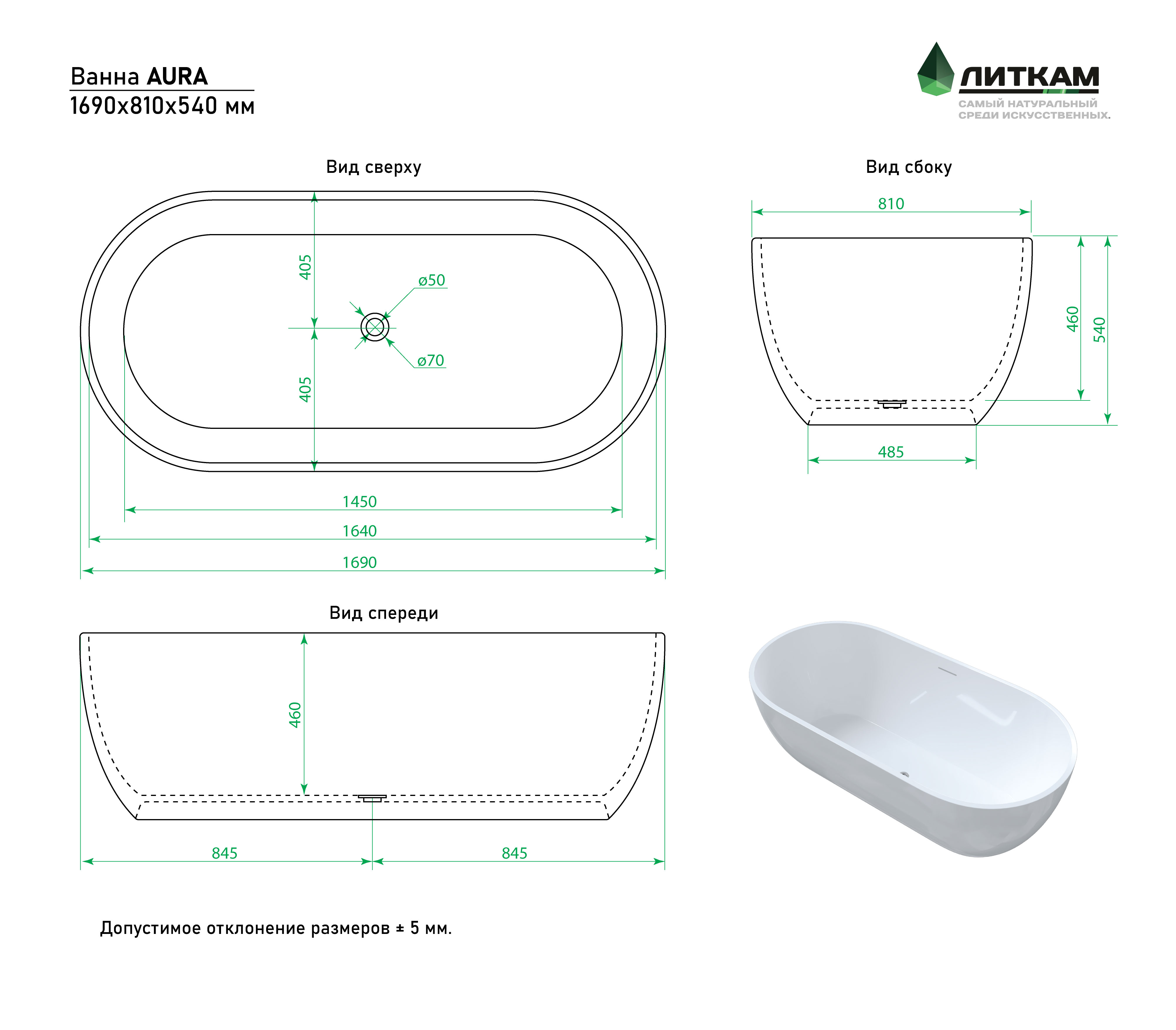 Ванна из литьевого мрамора (искусственный камень) AURA 169x81, отдельностоящая