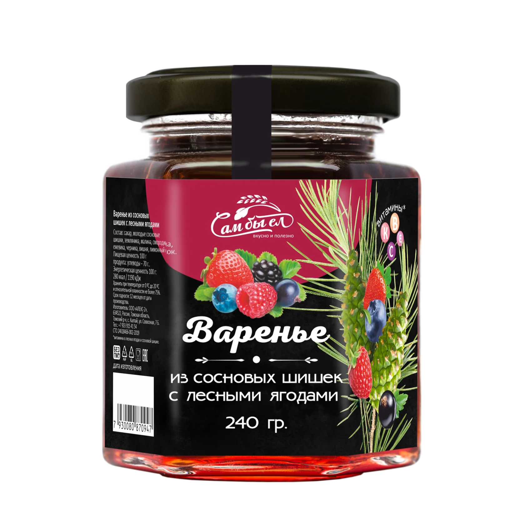 сахар, вода питьевая, натуральные сосновые шишки, малина, клубника, смородина черная, ежевика, черника и лимонный сок