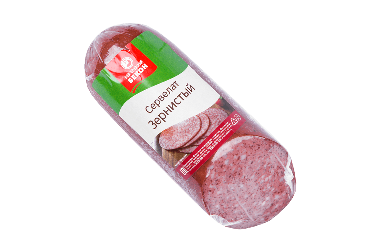 Сервелат Зернистый — варёно-копчёная колбаса, имеющая мелкозернистую структуру. Изготавливается из отборной свинины. Добавление куриных грудок делает сервелат более нежным и мягким.