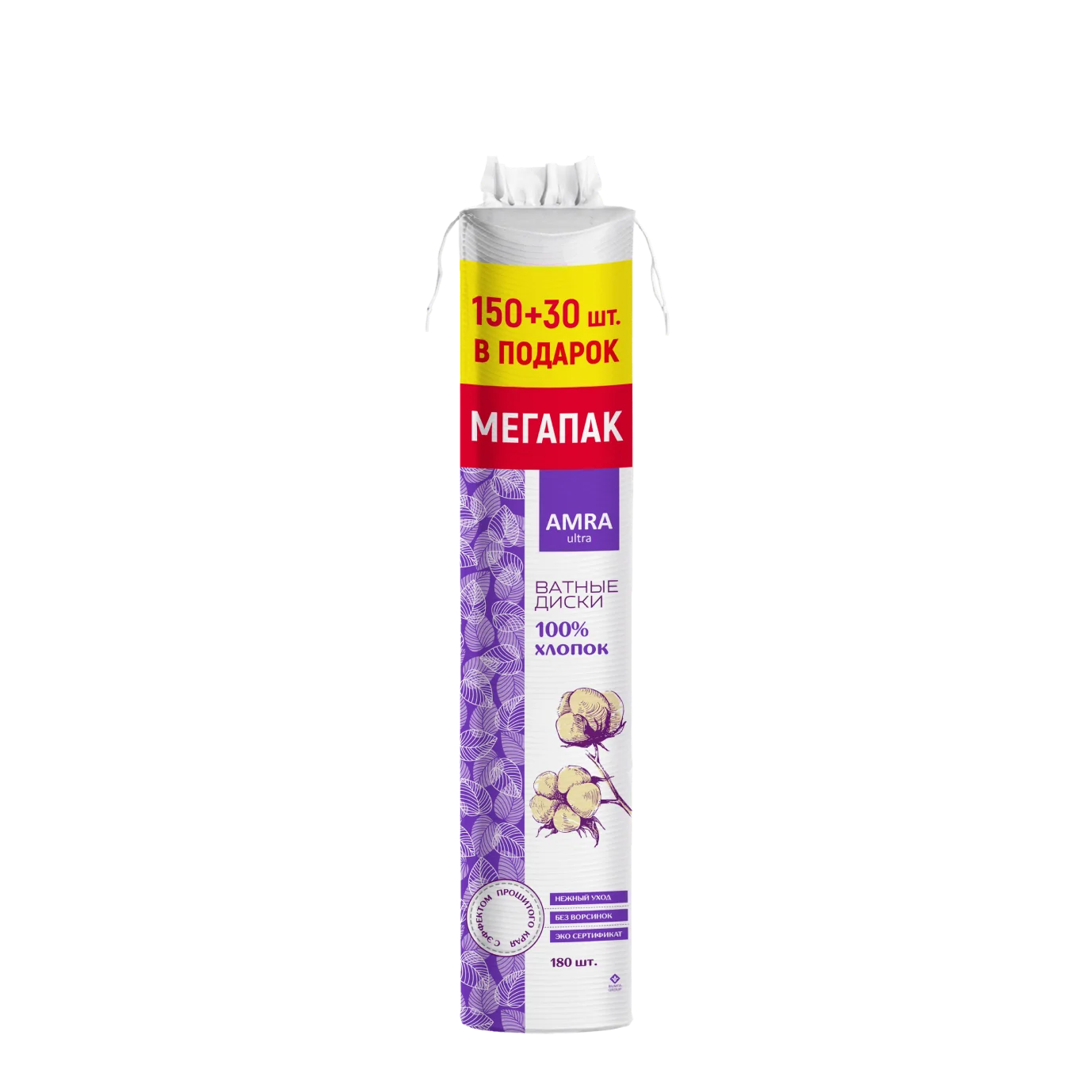 Ватные диски AMRA изготовлены из 100% хлопка, обладающего высокой впитываемостью, что позволяет эффективно удалять излишки косметики. Благодаря нескольким циклам очистки полотно для дисков получается белоснежным, однородным, без ворсинок и посторонних примесей. Диски имеют прошитый край и оптимальную плотность 165 г/м2, что не даёт им расслаиваться при использовании, обеспечивая нежный уход. Диски без запаха, в упаковке - 180 шт.
