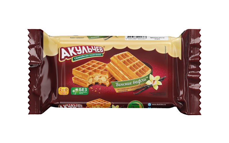 Венские вафли от «Акульчев» — сдобные сэндвичи с ароматом домашней выпечки и разнообразными начинками, завоевавшие достойное место среди кондитерских изделий на полках в магазинах. Этот вкусный и сытный десерт вот уже 20 лет радует сладкоежек всех возрастов не только в России, но и во всем мире. Мы были первой компанией, которая разработала уникальную рецептуру мягких вафель в нашей стране. На ваш выбор — широкая линейка начинок: сладкие фруктово-ягодные с тонкой кислинкой, нежные йогуртовые, густые сливочные. Каждый член вашей семьи найдет среди наших венских вафель свой любимый вкус!