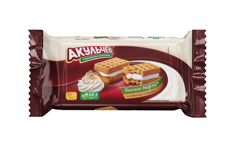 Венские вафли от «Акульчев» — сдобные сэндвичи с ароматом домашней выпечки и разнообразными начинками, завоевавшие достойное место среди кондитерских изделий на полках в магазинах. Этот вкусный и сытный десерт вот уже 20 лет радует сладкоежек всех возрастов не только в России, но и во всем мире. Мы были первой компанией, которая разработала уникальную рецептуру мягких вафель в нашей стране. На ваш выбор — широкая линейка начинок: сладкие фруктово-ягодные с тонкой кислинкой, нежные йогуртовые, густые сливочные. Каждый член вашей семьи найдет среди наших венских вафель свой любимый вкус!