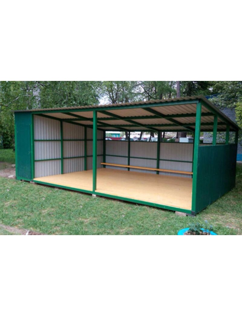 Веранда бюджет стандарт с кладовкой - это крытое сооружение (теневой навес), часто используемое в детских садах или частных домах, совмещающее открытую площадку для игр с закрытым хозяйственным отсеком. Она предназначена для защиты детей от солнца и дождя во время прогулок, а кладовка служит для удобного хранения игрушек, инвентаря, самокатов или колясок. Размеры с кладовкой (длина/ширина/высота): 4,2 - 6 (или 7) - 2,5 (2,1) м. Встроенная кладовка (глубина / ширина / высота): 4 - 1 - 2,5 м. Дверь кладовки распашная, есть ушки для навесного замка.
