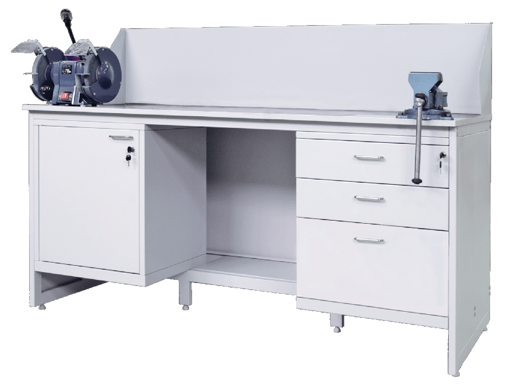 Возможна комплектация защитным экраном, тисками, электроблоком, светильником. Прорезиненная поверхность для проведения тяжелых механических работ. ПРЕИМУЩЕСТВА Укрепленный каркас основания стола с регулируемыми опорами. Центральный замок блокирует все ящики/дверцы в закрытом положении