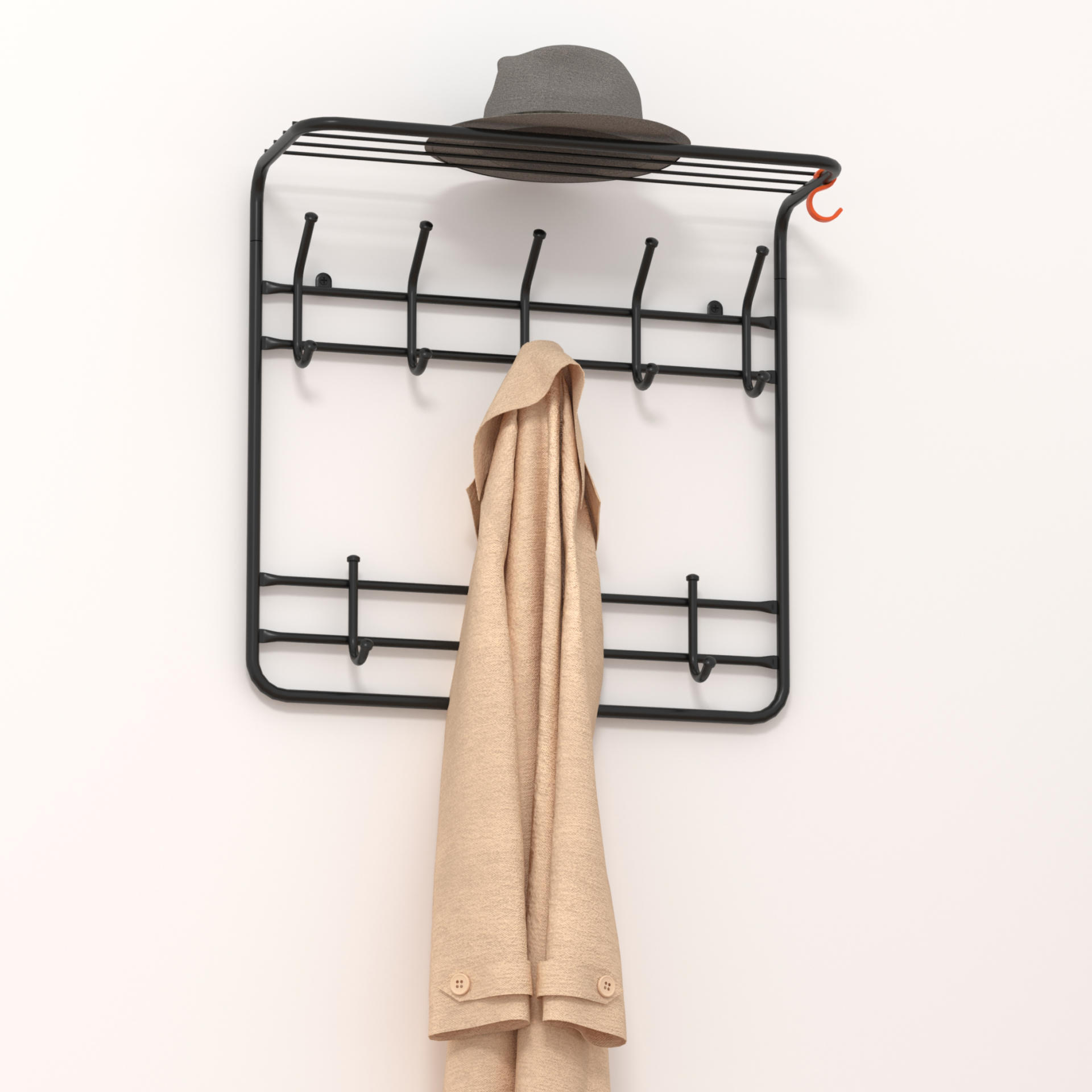 Отличительные особенности: — надежная разборная конструкция — компактная 2-х ярусная вешалка с 8-ю крючками — удобная полка для хранения головных уборов — допустимая нагрузка до 5 кг на крючок — Удобный пластиковый крючок для мелочей — Расстояние между крепёжными отверстиями 500 мм Назначение — Для размещения одежды Материал — Сталь, полимерное покрытие Индивидуальная упаковка — 630х530х100 мм Габариты (Д*Ш*В) — 60*22*58 см Вес Нетто — 1,9 кг Вес Брутто — 2,4 кг доступны цвета: белый, коричнеый, черный