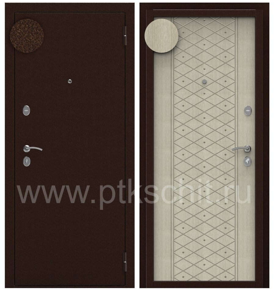 Эстетичная отделка. Внешняя поверхность оформлена плёнкой «Лиственница белёная» с покраской «Антик Медь», а внутренняя сторона оснащена панелью МДФ ПВХ толщиной 6 мм с фрезеровкой Р48.