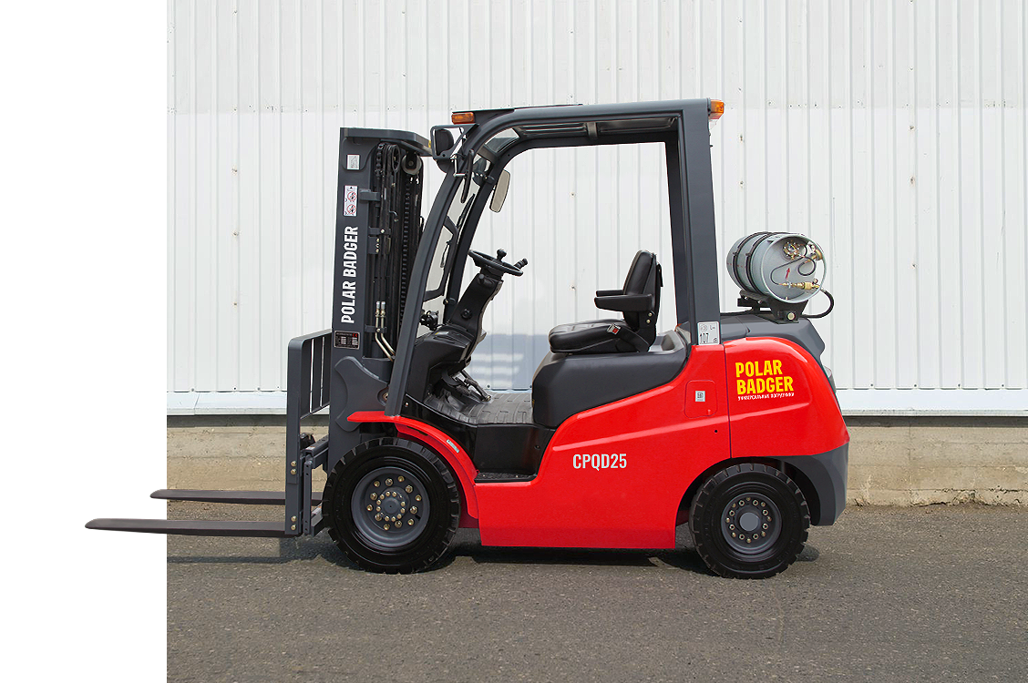 Вилочный погрузчик «Polar Badger» CPQD25 - газ-бензиновые погрузчики , оптимальное решение для одновременной работы на улице и в закрытом помещении (например, магазины стройтоваров, деревообрабатывающие предприятия). Грузоподъемность - 2500 кг, мощность двигателя - 37,4 кВт (50,8 л.с.), высота подъема (стандарт) - 3000 мм, радиус поворота - 2290 мм, размер вилки (стандарт) - 1070x120x45 мм, масса - 3810 кг, габариты - 2644х1150х2145 мм.